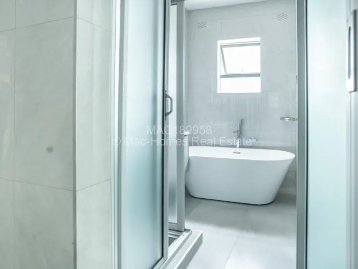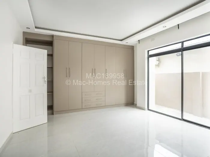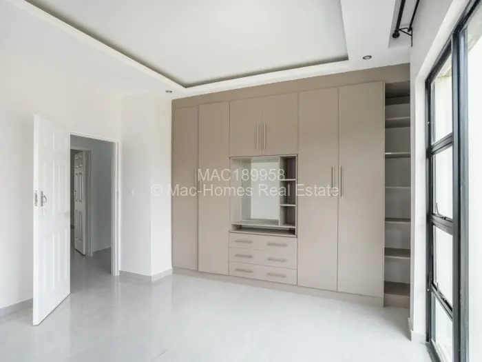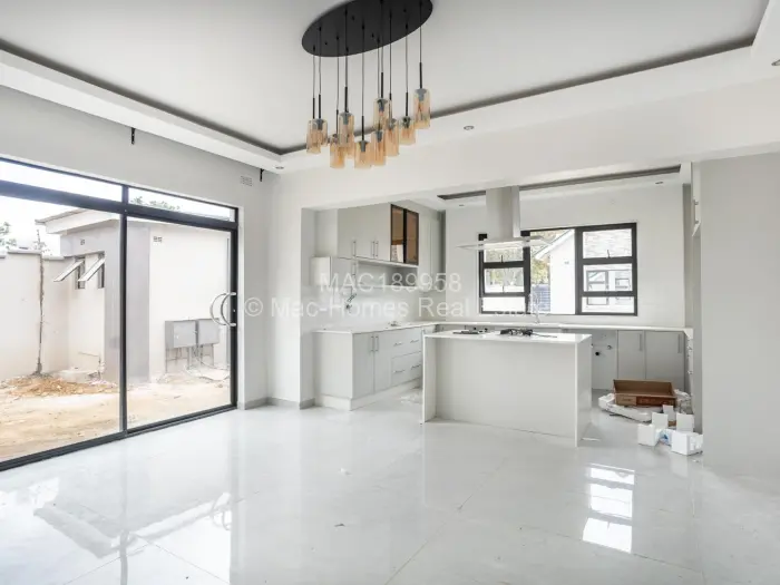 Mac-Homes presents the only unit remaining in this sought-after location of Borrowdale West. This brand New luxurious high roof cluster home in a complex of 5 dwellings comprises 3 spacious bedrooms, a main ensuite, all bedrooms have BICs, an open plan lounge, dining, and kitchen fitted with a combined 2 plate electric and 2 burner gas stove, a granite top, 5KV solar backup, 250lt solar geyser, 5000lt water tank, and wifi trunking.