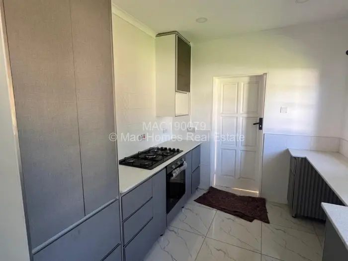 Three bedrooms, each with built-in cupboards, and two bathrooms, one of which has a tiled shower enclosure. One lounge anchors the interior, with tiled flooring running through the common areas and bedrooms alike. The fitted kitchen has gas cooking practical for a rental where you want to know the stove works regardless of what else is happening with supply.